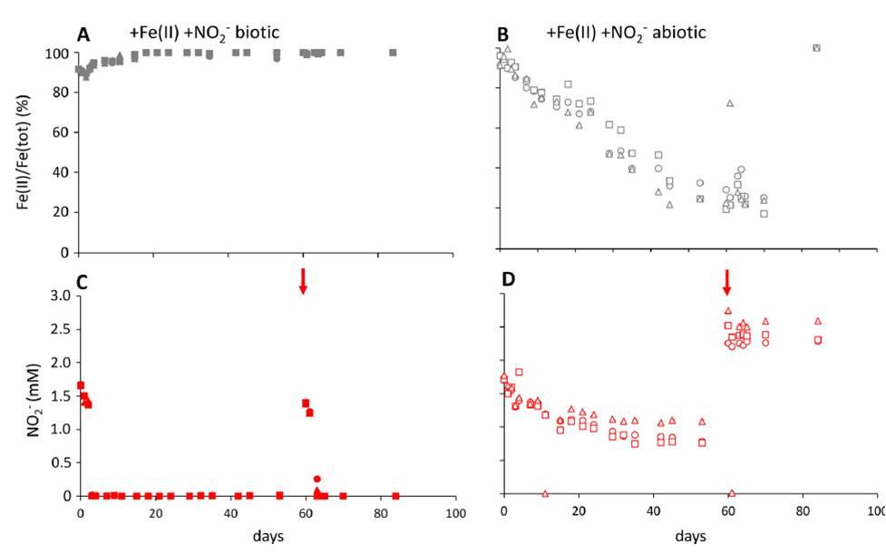 圖3、亞硝酸鹽濃度(紅色)和Fe(II)/Fe(tot)比率(灰色)在生物(填充的符號(hào))和非生物(空心結(jié)構(gòu)符號(hào))隨著時(shí)間的變化情況(三角形,正方形,和鉆石符號(hào)顯示的三倍體系)。其中在初始修正后的Fe[II]濃度為5 mM,亞硝酸鹽濃度為2 mM,微觀體在第60天(見箭頭)加入亞硝酸鹽后呈現(xiàn)的體系濃度情況。