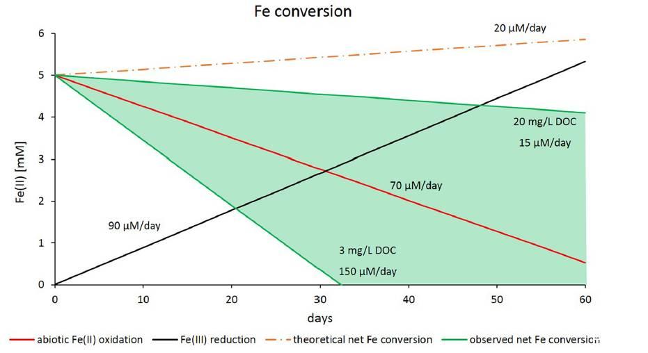 圖5、鐵的轉(zhuǎn)化率(同步顯示的凈利率,其中Fe[II]氧化和Fe[III]的還原都依賴于DOC的濃度。選用5mM的Fe(II)或Fe(III)和2mM的硝酸鹽或亞硝酸鹽進(jìn)行的微觀實(shí)驗(yàn)的相關(guān)測(cè)試。理論鐵的轉(zhuǎn)換率顯示了Fe(II)的氧化反應(yīng)只與亞硝酸鹽的反應(yīng)有關(guān)的假設(shè)。理論Fe的轉(zhuǎn)換率(橙色虛線)與實(shí)測(cè)Fe的轉(zhuǎn)化率區(qū)別。