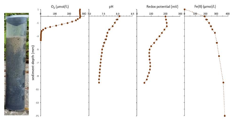 圖1、康斯坦斯湖沿岸沉積巖心中測(cè)試的氧,pH,氧化還原電位,和Fe(II)的剖面圖。從圖中可以看出,所取的海洋沉積物中的氧的濃度是隨著距離界面越遠(yuǎn),其氧的濃度最近降低,大約在界面下4mm處體系中的氧濃度幾乎為零。對(duì)于沉積物巖心中的pH值也是隨著沉積物界面處的深度增加表現(xiàn)為不斷變小。而對(duì)于氧化還原電位值表現(xiàn)為先減小后并最后穩(wěn)定120mv,但是體系中的二價(jià)鐵則表現(xiàn)為隨著距離沉積物界面處的距離增加,其二價(jià)鐵的濃度逐步增加。