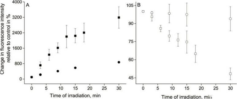 圖1、(□,■)MCT油和(○,●)LSO中BODIPY 665/676的熒光強度變化。這些油中包含DTBP(5.7μM)和BODIPY 665/676(1μM),并用300 nm紫外線燈照射。(A)在λex 580 nm處(實心符號)測量熒光強度,(B)在λex=670 nm處(實心符號)測量熒光強度。