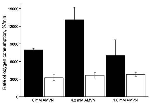 圖3、用混合油和各種濃度的添加的AMVN在37°C下測得的Tween-20穩定乳液的耗氧率,以每分鐘耗氧百分比表示。實心條:30 wt%MCT油和70 wt%SFO的混合物。空心棒:70重量%MCT和30重量%SFO的混合物。