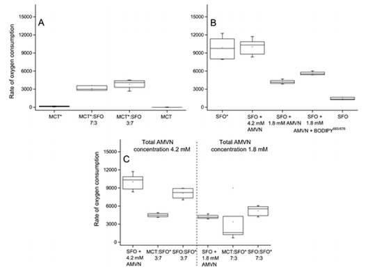 使用克拉克型氧微呼吸電極(unisenses)實時監測乳液中的氧濃度變化情況。通過使用Unisense皮安表(Unisense PA2000,丹麥)記錄氧濃度數據。具體操作過程如下:首先將需要研究的乳液樣品轉移到帶有研磨玻璃塞子的2.7 mL玻璃容器中(微呼吸瓶),氧氣微呼吸電極穿過玻璃塞中心然后將其置于37°C的水浴中。Unisense微呼吸系統可每隔30秒記錄一次微呼吸瓶內氧的濃度(Unisense PA2000),記錄一段時間內的氧濃度的值的變化情況,并將其自動繪制為隨時間變化的氧氣濃度變化的函數圖,獲得的耗氧曲線的線性部分可用于確定該時間段內的氧的消耗速率。研究的樣品包括MCT油乳液、SFO乳液、含有BODIPY 665/676的SFO乳液、MCT油和SFO以重量比3:7或7:3混合的混合油乳液。