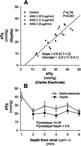 圖5、用Clarke型電極和Oxylite探針在大鼠腎臟中測量組織PO2的比較。A:響應(yīng)于ANG II的注入,在大鼠腎髓質(zhì)中通過Clarke型和Oxylite探針同時測量組織PO2的散點圖(n=5)。使用最小積方法(模型II)獲得最佳擬合線。圖B:同時使用克拉克型氧電極(□,n=6)和Oxylite探針(n=6)測試距腎臟表面不同深度的組織PO2。P值代表2次方差分析的結(jié)果,測試通過2種方法獲得的值是否以與皮層表面下方深度無關(guān)的方式(P探針類型)或相關(guān)的(P探針類型*深度)系統(tǒng)地不同。