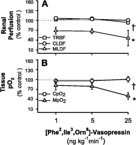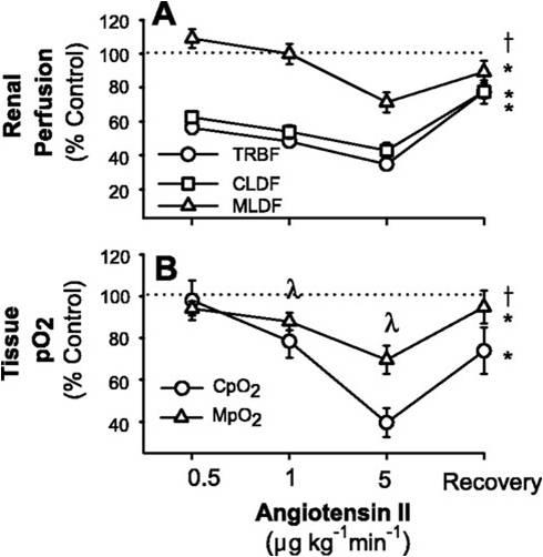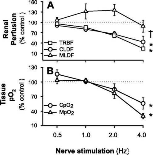 研究人員通過測試對刺激的反應(yīng)來確定腎髓質(zhì)氧合是否獨立于皮質(zhì)血流量水平,這些刺激有選擇性地減少了皮質(zhì)或髓質(zhì)的血流量。在麻醉的兔子中加壓素的腎動脈輸注選擇性降低了髓樣灌注和PO2(分別為-54±24和-50±10%),但對皮質(zhì)灌注或組織氧合沒有明顯影響。相反刺激腎神經(jīng)導(dǎo)致腎皮質(zhì)缺血,總腎血流量減少。