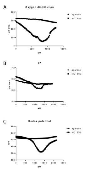 圖2、應(yīng)用微電極對瓊脂糖包埋的HCT116細(xì)胞純瓊脂糖培養(yǎng)基測試的一些物理化學(xué)性質(zhì)參數(shù),其中圖A測試的是氧氣的分布情況(測量步徑為20um),圖B測試的是pH(測量步徑為40um),圖C測試的是氧化還原電位(測量步徑為40um)。從圖中可以看出,瓊脂糖包埋的HCT116細(xì)胞體內(nèi)的氧氣濃度、pH、氧化還原電位是呈現(xiàn)逐漸降低然后在慢慢增加。并且表現(xiàn)為在球體中央?yún)^(qū)域內(nèi)的氧氣濃度、pH、氧化電位值最低。