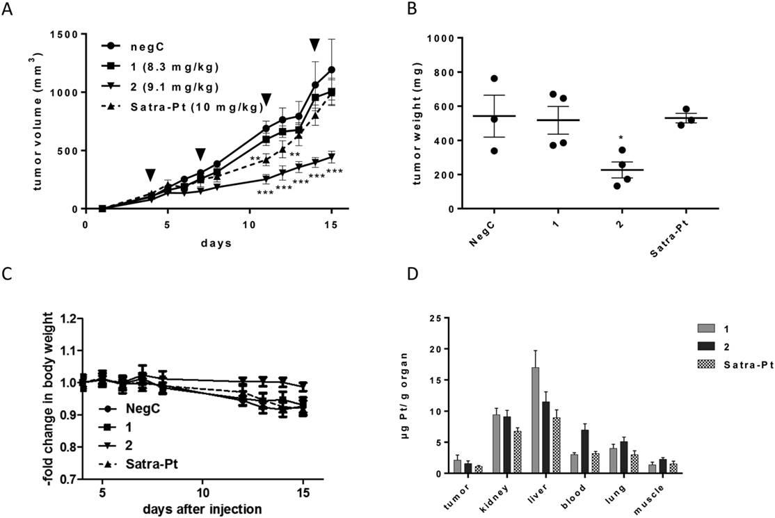 圖5、圖A表示的是在老鼠活體內(nèi)注入克分子數(shù)計量四價鉑類化合物1、2、賽特鉑化合物后,對于老鼠HT1080皮下細(xì)胞腫瘤在0-15天時間段內(nèi),腫瘤體積或重量的變化情況。圖B表示的是老鼠HT1080皮下皮下細(xì)胞腫瘤對于不同四價鉑類復(fù)合物的在第十五天時的腫瘤的重量情況。圖C表示的是實(shí)驗(yàn)老鼠注入了不同的四價鉑復(fù)合物后,老鼠在0-15的時間段老鼠的重量變化情況。圖D表示的是使用了ICP-MS分析老鼠不同器官組織體內(nèi)的鉑的含量。