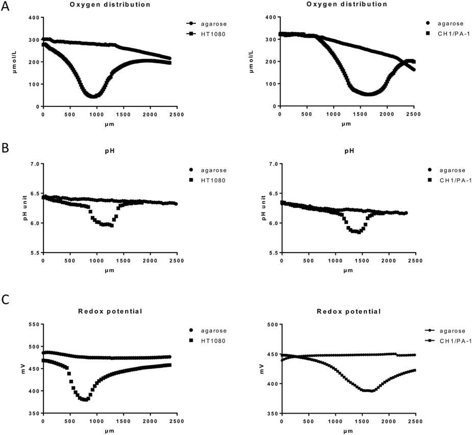 圖1、應(yīng)用微電極對瓊脂糖包埋的HT1080細(xì)胞和CH1/PA-1多細(xì)胞球體(直徑大于400um),純瓊脂糖培養(yǎng)基測試的一些物理化學(xué)性質(zhì)參數(shù),其中圖A測試的是氧氣的分布情況(測量步徑為20um),圖B測試的是pH(測量步徑為40um),圖C測試的是氧化還原電位(測量步徑為40um)。從圖中可以看出,在培養(yǎng)基球體中心位置的氧氣濃度、pH、以及氧化還原電位均最低,而純瓊脂糖的氧氣濃度、pH則是呈現(xiàn)逐漸降低的趨勢。