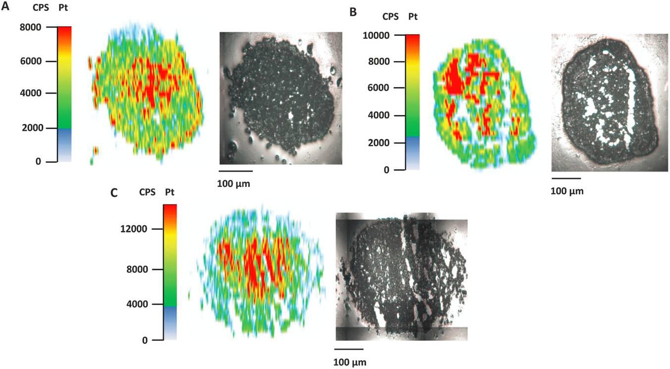圖4、HT1080細(xì)胞經(jīng)過四價鉑配合物(1、2)處理后,包封瓊脂球體內(nèi)的鉑的濃度分布情況。其中圖A表的是經(jīng)過四價鉑配合物1處理后的HT1080細(xì)胞內(nèi)的鉑含量分布,圖B表示的是經(jīng)過四價鉑配合物1處理后的HT1080細(xì)胞內(nèi)的鉑含量分布,圖C表示的是使用賽特鉑處理后的細(xì)胞內(nèi)的鉑含量分布。其中激光I燒蝕CP-MS測試的是使用了20um厚的冰凍切片樣品。