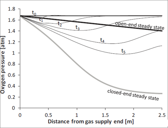 圖5、穩態條件下膜反應器的生物膜周圍通氣方式開放式(厚黑線)和封閉式(厚的灰色線)的氧分壓,和時間平均值的瞬態條件從開放到封閉式(淺色的黑色線條)。瞬態壓力平均值之間與時間的關系,初始時間和t1=2分鐘,t2=5分鐘、,t3=0分鐘、t4=20分鐘、t5=30分鐘。達到穩態條件所需的時間一般是60分鐘。