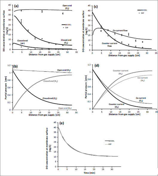 圖3、實驗室膜反應器中和模型膜反應器中的溶解氧的示意圖。圖a表示的是反應器的內膜壁管采用貫通式和閉端式兩種方式的溶解氧濃度剖面分析圖。圖b表示的模擬O2、N2分壓對于開放式和封閉式純氧氣供應體系中的反應器中的生物膜表面附件的溶解氧濃度剖面圖。圖c表示的是封閉式膜反應器使用純氧體系通氣的條件下的體系呢弄的溶解氧濃度。圖d表示的是模擬O2、N2分壓對于封閉式和逆流操作膜生物那反應器的影響。圖e表示的是系統性開端到閉端操作的過程中,膜反應器體系中的氧濃度隨時間的變化情況。