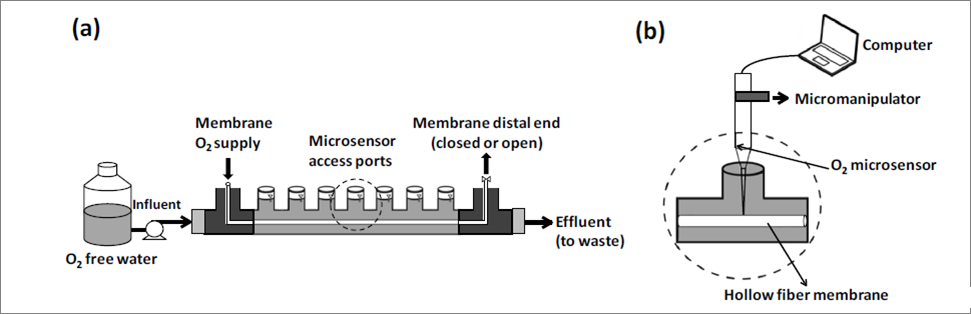 圖1、圖a表示的是曝氣膜生物反應器的流動單元示意圖。其中氧氣或空氣是從反應器的截面玻璃管中的中空纖維膜處通過。圖b表示的是用微電極測試膜生物反應器中的中空纖維膜表面邊界傳遞層中的溶氧濃度的示意圖。