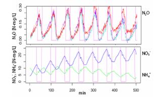 ![]() NH4+、NO3- 、O2 和N2O數(shù)據(jù)系列圖(14天測量周期中的一個6天區(qū)段),包括低氧設定值和兩個高負荷期中的一個。 |